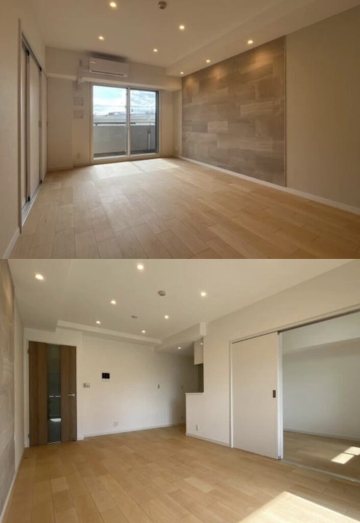 石目調のアクセントクロスのあるお部屋。形は一見長方形なので普通かと思われがちですが、キッチンが隠れたところにあるので今の時代としては珍しい形で、アクセントクロスがあり、LDKとつながっている洋室も出入りできるよう引き戸前には大きな家具が置けないといった、実は制限もある間取りにはなります。