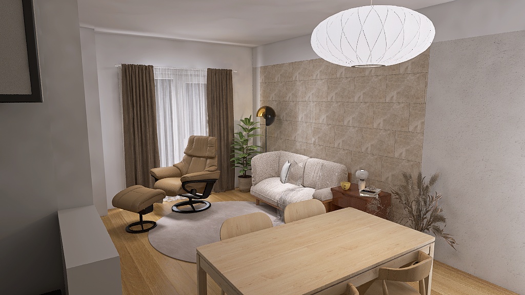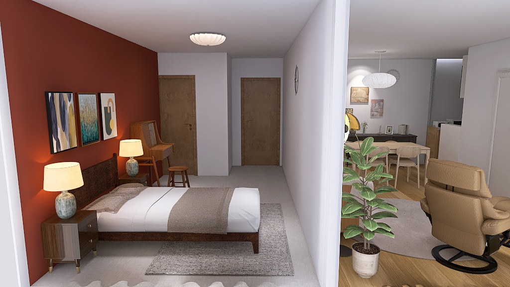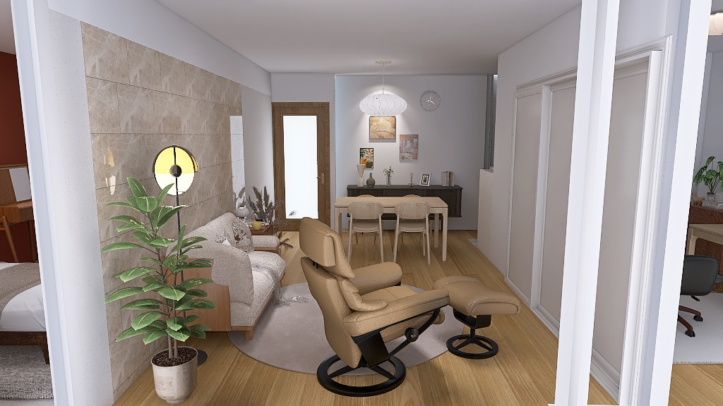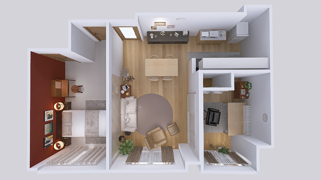 中央のお部屋はLDKで料理、食事、リラックスができるお部屋。右側のお部屋は読書や在宅ワークをするための書斎。左側のお部屋は寝室と着替えをするお部屋です。